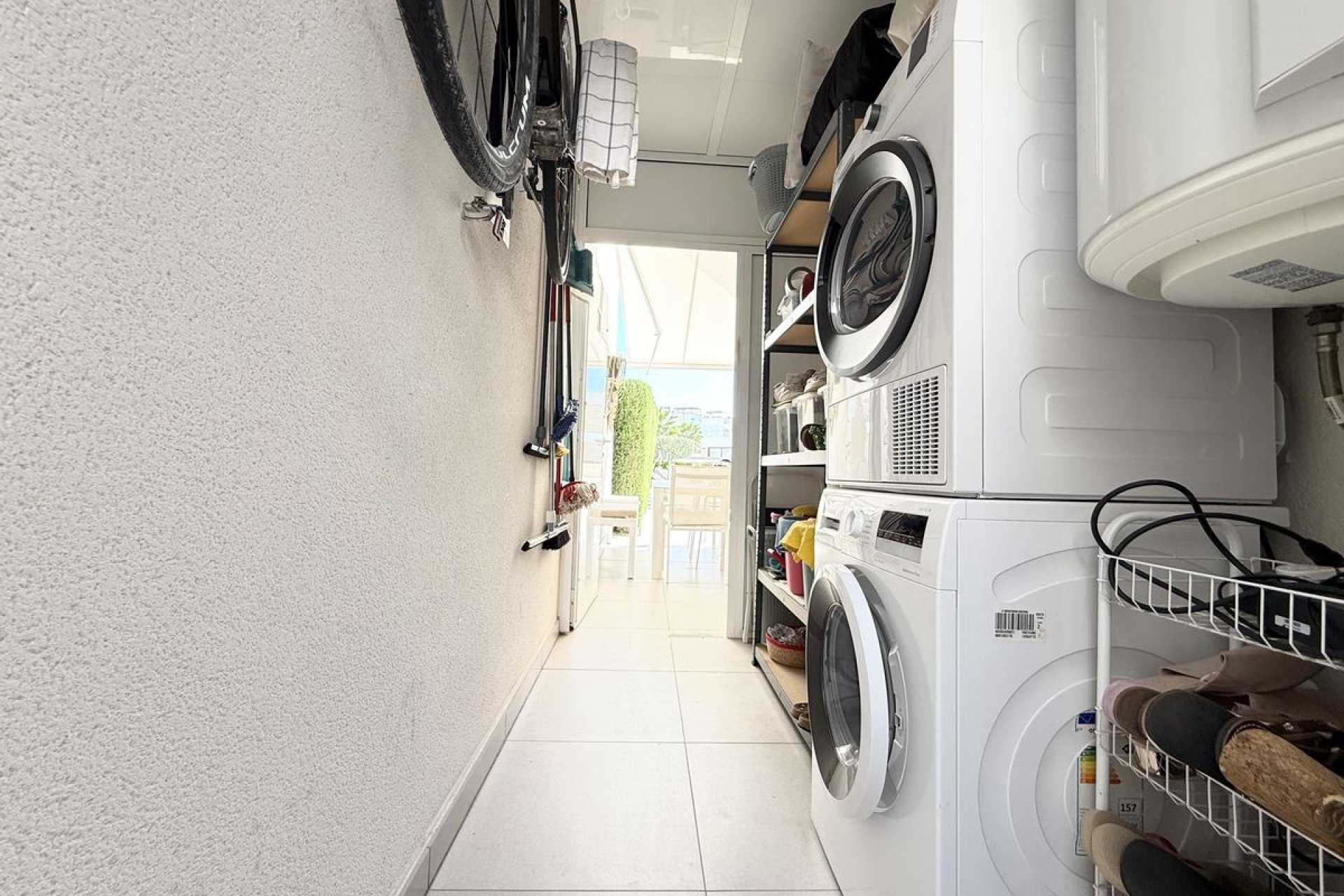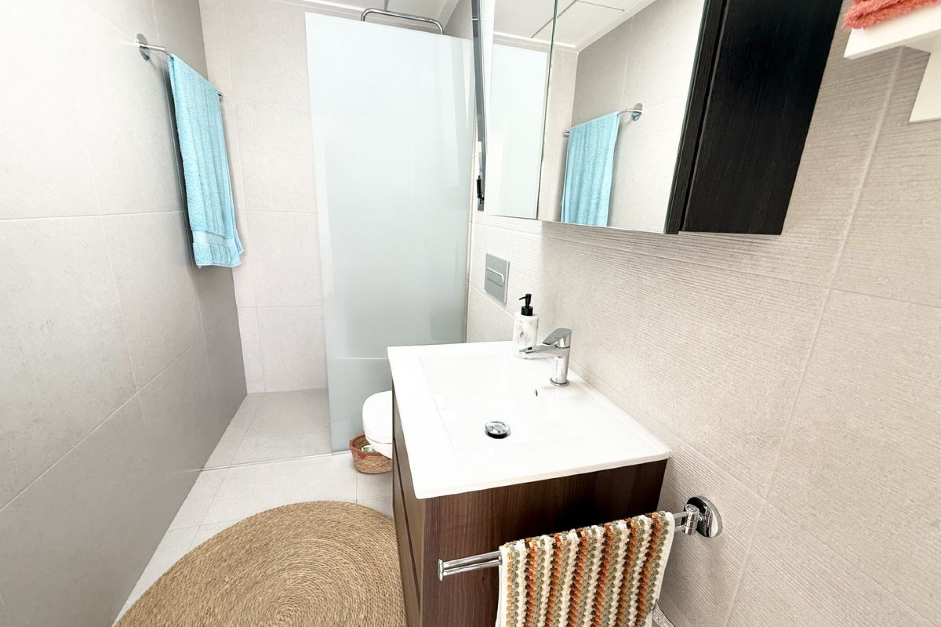 Inside, you will find a fully equipped Bosch kitchen, a bright lounge with electric louver blinds and vertical blinds, and ducted air conditioning for year-round comfort. The villa offers two spacious bedrooms, both located upstairs, each with floor-to-ceiling fitted wardrobes. The bedrooms share a modern bathroom with a walk-in shower, while a second bathroom with shower is conveniently situated on the ground floor. From one of the bedrooms, you can directly access the spacious 32 m² solarium — the perfect spot to relax or entertain while taking in the beautiful views.