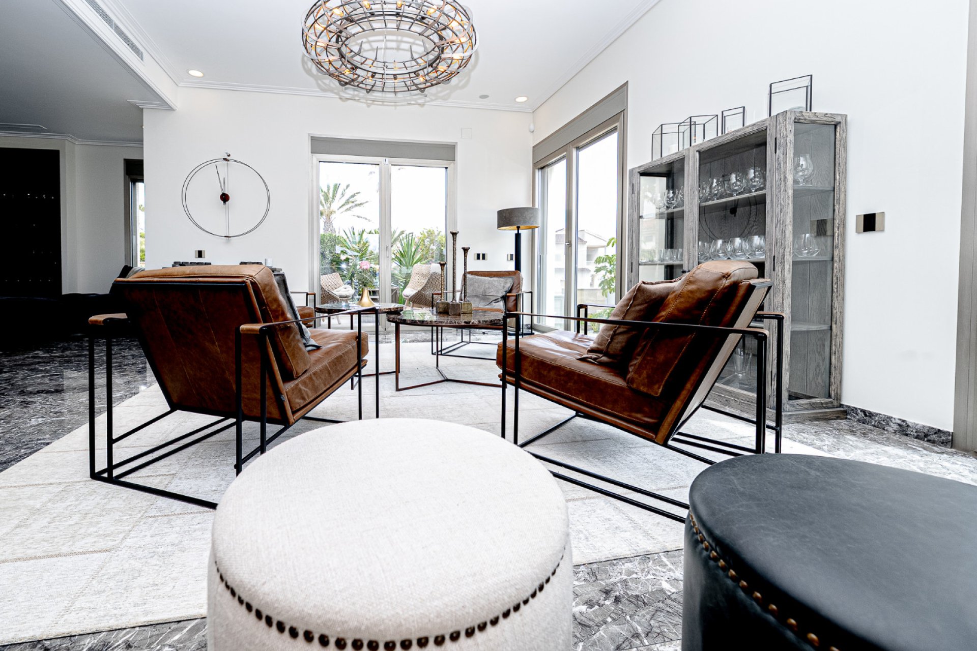 This contemporary beachside villa, built in 2022, offers luxury coastal living just steps from the sea. Set on a 665.66 m² gated plot, the home boasts 442 m² of living space across multiple levels—including a 186.60 m² underbuild featuring a spacious private gym, a large guest bedroom, and direct access to the private garage with room for up to two cars and generous storage space. The layout includes an open-plan living and dining area with expansive floor-to-ceiling windows, a statement fireplace, and a sleek modern kitchen, complemented by a fully equipped utility/laundry room. The home offers six spacious bedrooms and four designer bathrooms—each fitted with Arital design elements and premium Wolf appliances.
