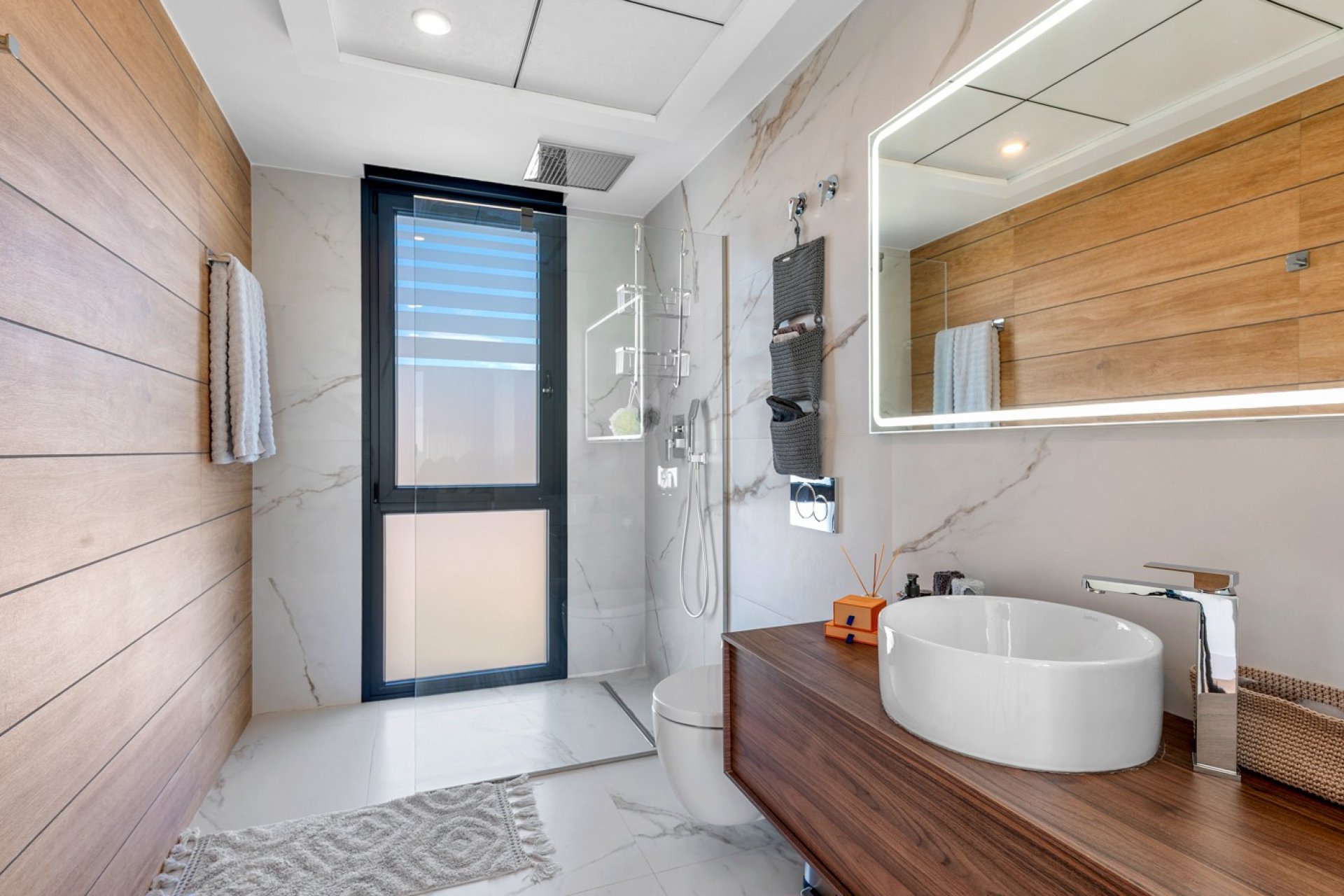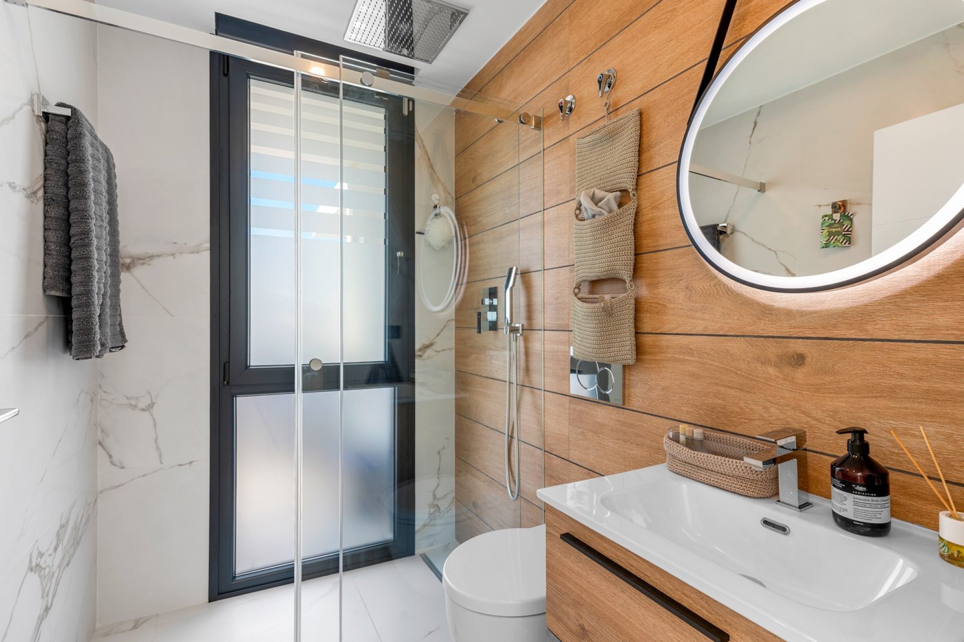 The ground floor also houses two elegantly appointed bedrooms are located on this level, one to the left and one to the right each with en-suite bathrooms, built-in wardrobes, garden, pool views, and partial vistas of the Salt Lakes. Underfloor heating runs throughout the entire property, enhancing comfort in every season, while a fully integrated smart home system allows complete control of the villa remotely from anywhere in the world.