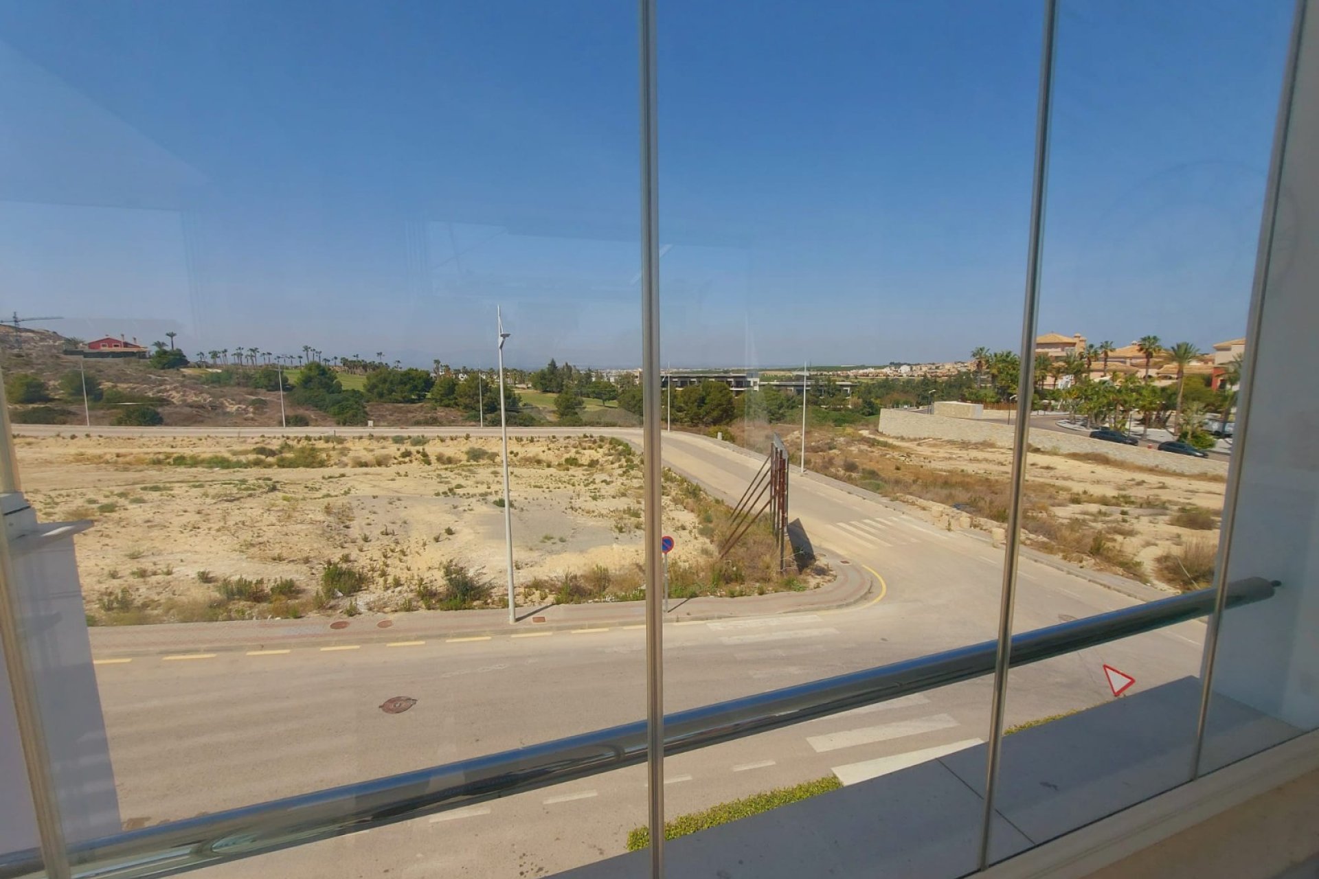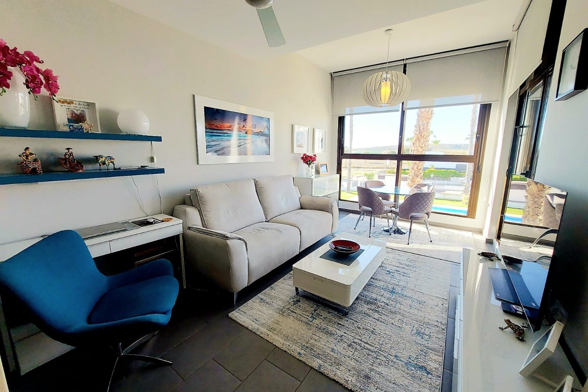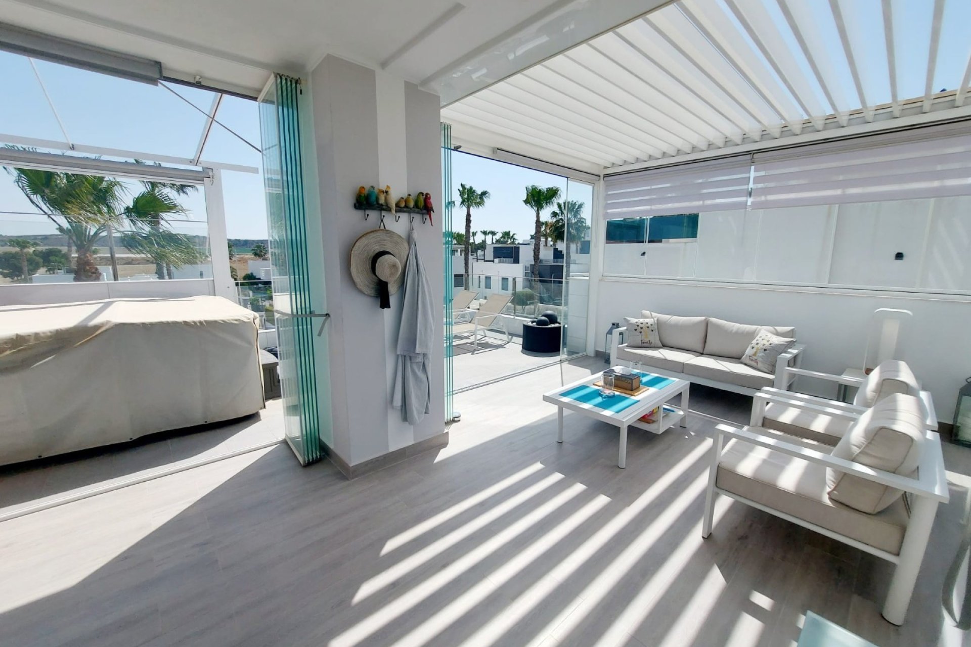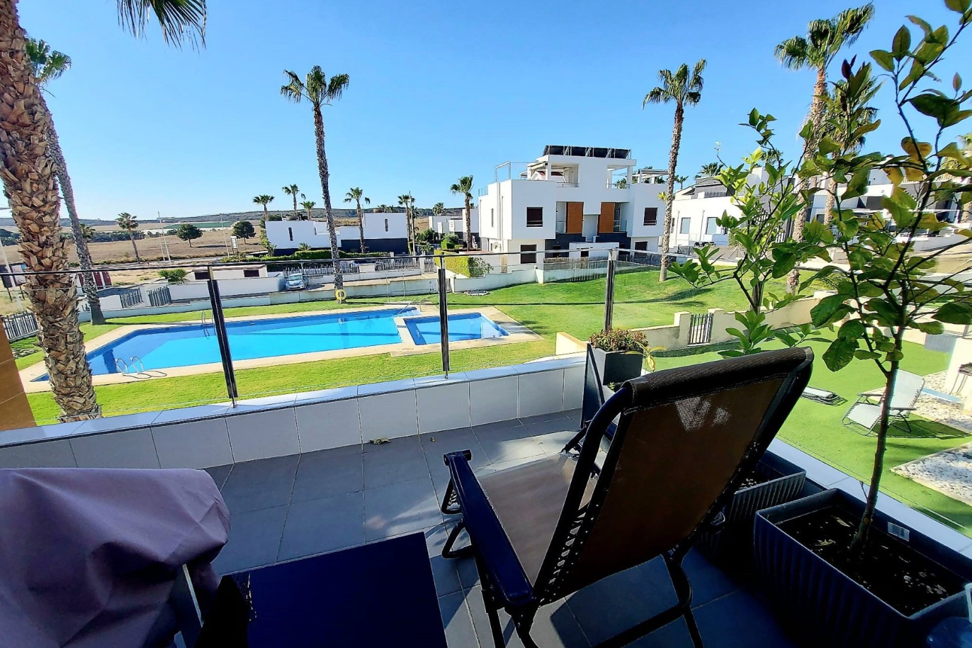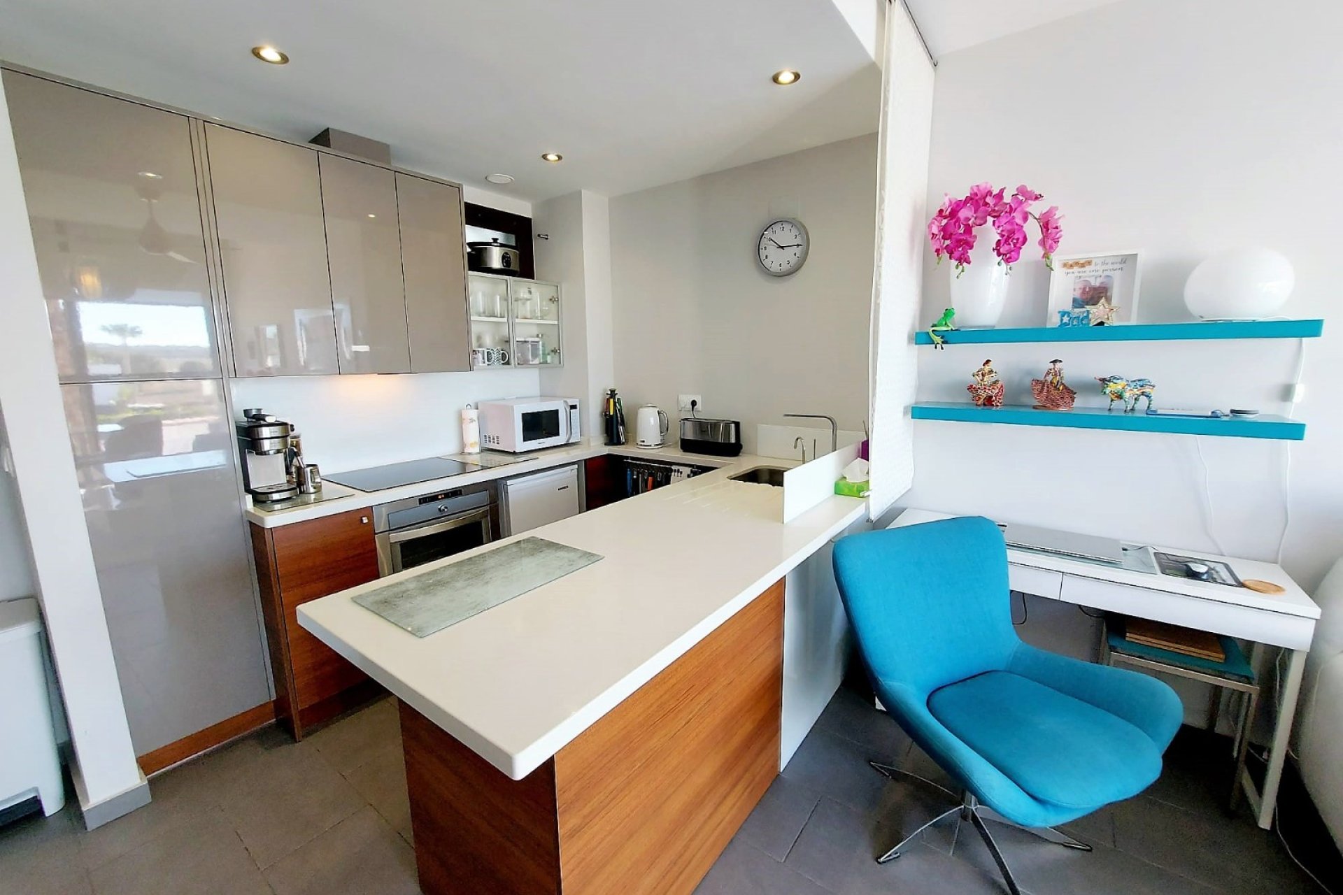 An exceptional south facing home that will not disappoint. Boasting outstanding views from either side of this top floor 2 bedroom, 2 bathroom apartment. Located within walking distance of the 5 * La Finca Golf Resort, this is an ideal property for those who love to holiday in the sun, alternatively it would make a fabulous permanent home on the Costa Blanca South. As you approach the property, you will instantly see the quality home which the current owners have created. Taking the staircase to the first floor, the secure entrance doors will lead you into the contemporary open plan living area. This is a wonderful space for entertaining and comprises of a well equipped kitchen, lounge and dining area with fabulous views over the communal pool. Taking the small inner hall, you will find access to the bedrooms and house bathroom. Both bedrooms are installed with Air-conditioning and have built in wardrobes. The master bedroom has the benefit of its own dedicated en-suite facilities, plus, access out onto a sunny aspect pool facing balcony. Taking the fixed staircase from the entrance, you have access up and out onto the roof top solarium. This area has been transformed for year round enjoyment. A fabulous relaxing spot, with ample storage, where you can take in extended views of the Algorfa area and beyond. With glass curtains and an electronic roof which can opened/closed for your comfort. This can also be used for alfresco dining with ample work surfaces and a plumbed sink. Your linen is made easy up here too, this is where you will find plumbing for the washing machine.