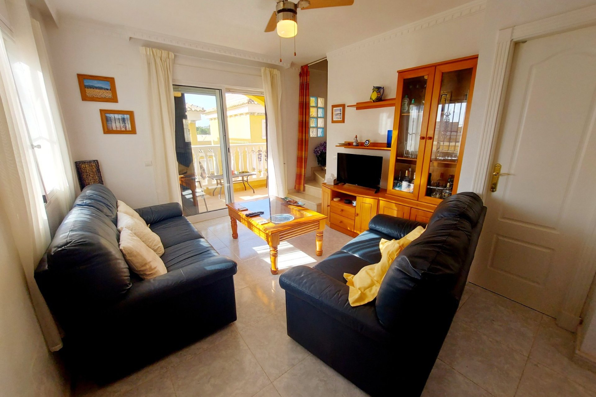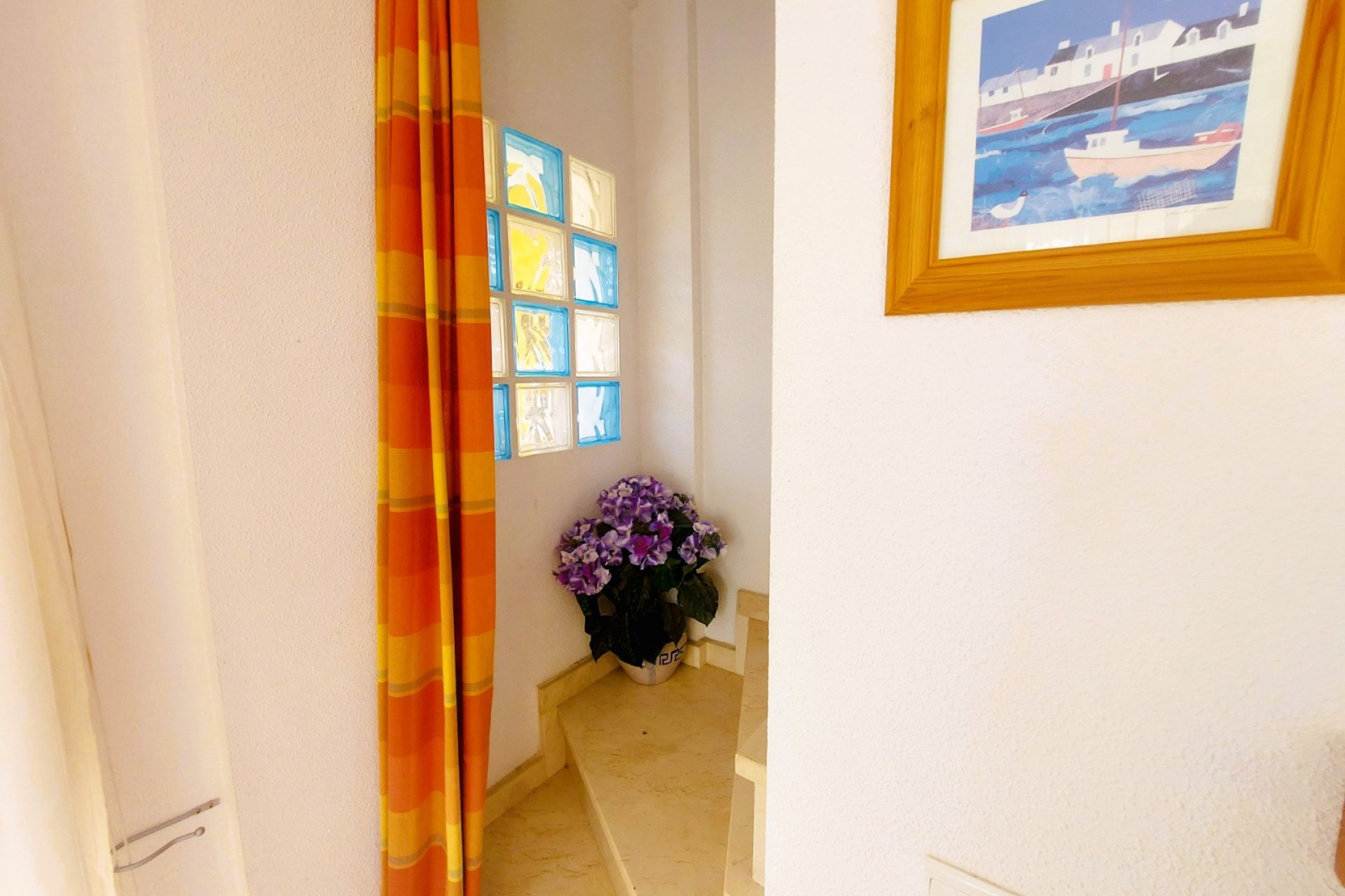 Into the house and you have an open plan living and dining room with American kitchen. This room has plenty of light with lots of windows and patio doors to the front. Here you have a lovely south facing terrace, big enough for a table and chairs. The kitchen has a range of wall and base units, hob, oven, extractor and space for a fridge freezer. Just off the lounge there is a useful guest cloakroom. Stairs take you to the second floor where you have a family bathroom and two double bedrooms, both with built in wardrobes. The master has patio doors onto a further south facing terrace. Spiral stairs from here take you to a large private solarium with far reaching views over the urbanisation, countryside and on a clear day you can see the sea! There is plenty of space up here to have sun loungers, patio furniture etc in order to enjoy the sun all day.
